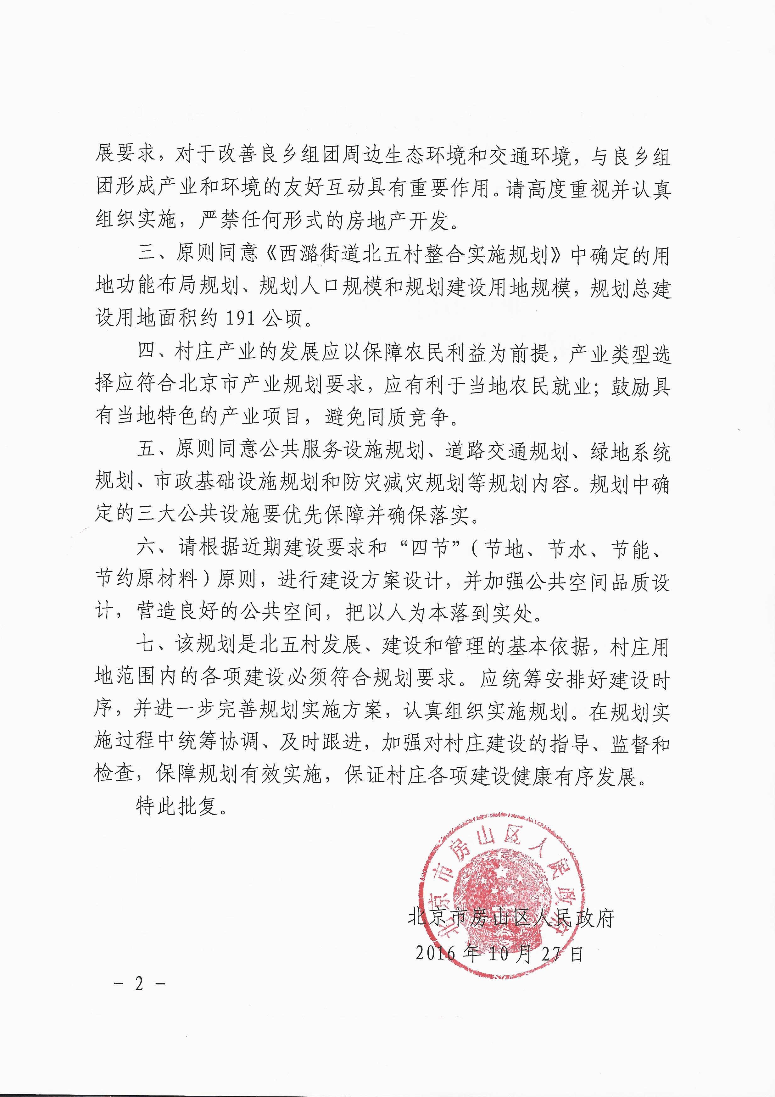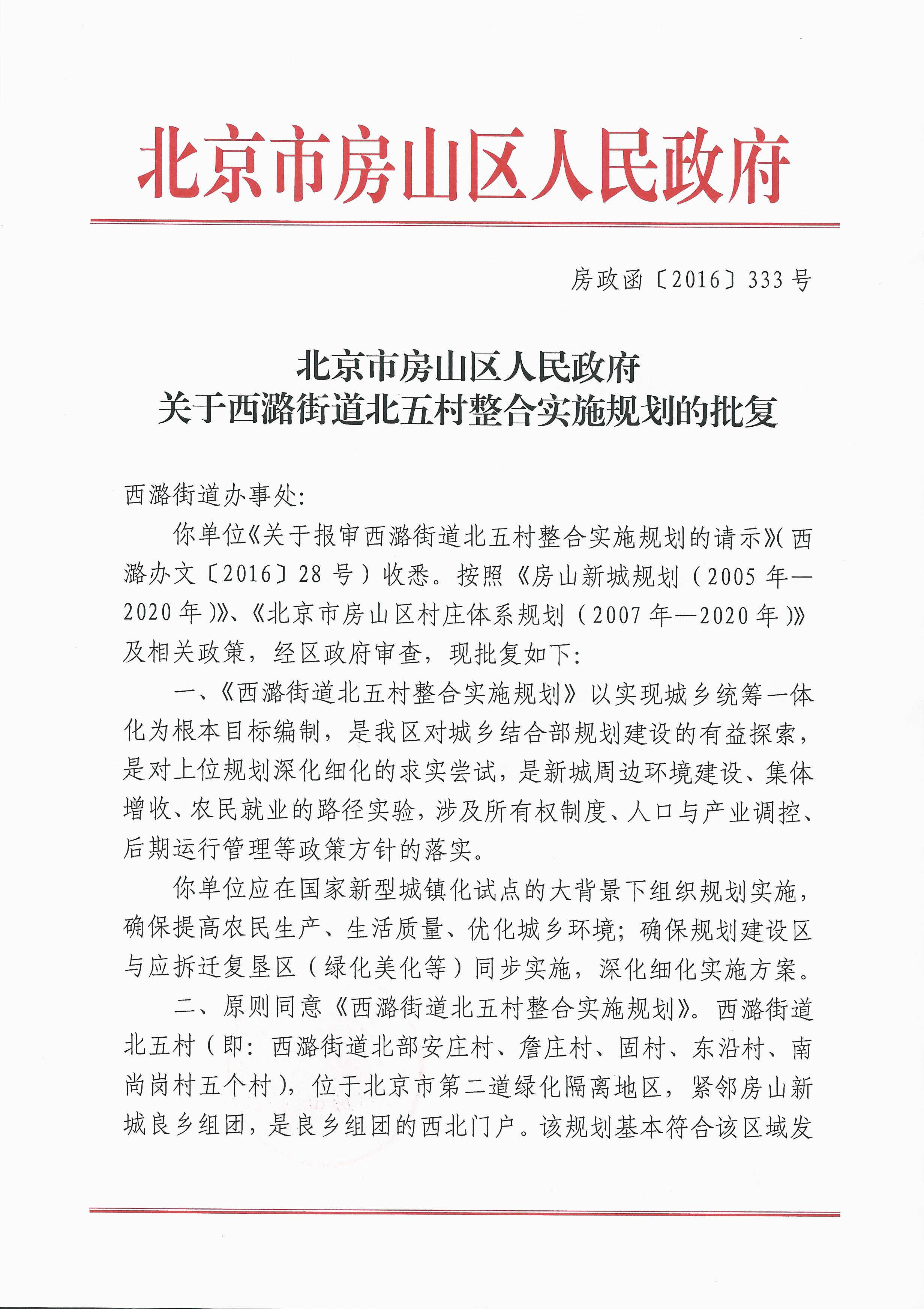 北京市房山区人民政府关于西潞街道北五村整合实施规划的批复